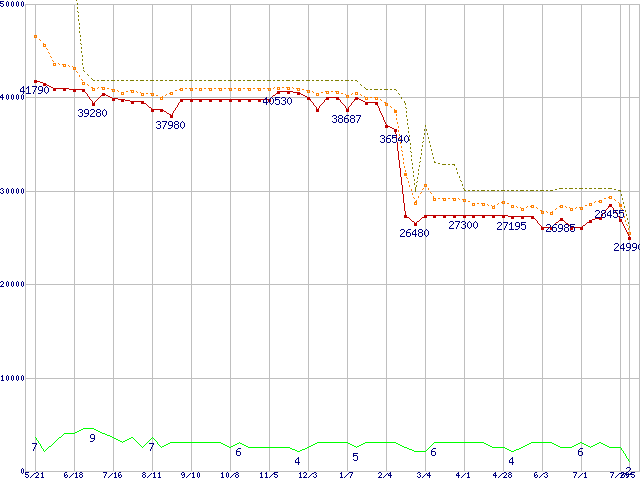 ※このグラフは過去のデータも税率5%相当に調整した税込み相当額のグラフです。 税率変更や、総額表示方式導入(2004年4月)の影響は除いています。 | | | ●凡例 | 最安値 (点線部は販売店未確認 または未調査) | 平均値 | 最高値 | ショップ数 |