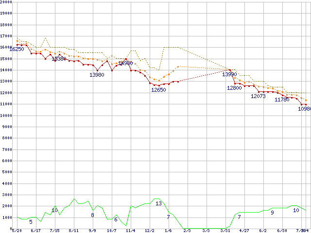※このグラフは過去のデータも税率5%相当に調整した税込み相当額のグラフです。 税率変更や、総額表示方式導入(2004年4月)の影響は除いています。 | | | ●凡例 | 最安値 (点線部は販売店未確認 または未調査) | 平均値 | 最高値 | ショップ数 |