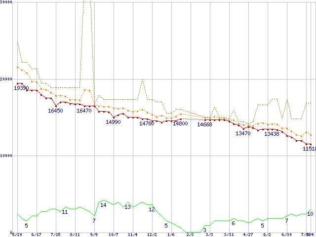 ※このグラフは過去のデータも税率5%相当に調整した税込み相当額のグラフです。 税率変更や、総額表示方式導入(2004年4月)の影響は除いています。 | | | ●凡例 | 最安値 (点線部は販売店未確認 または未調査) | 平均値 | 最高値 | ショップ数 |
