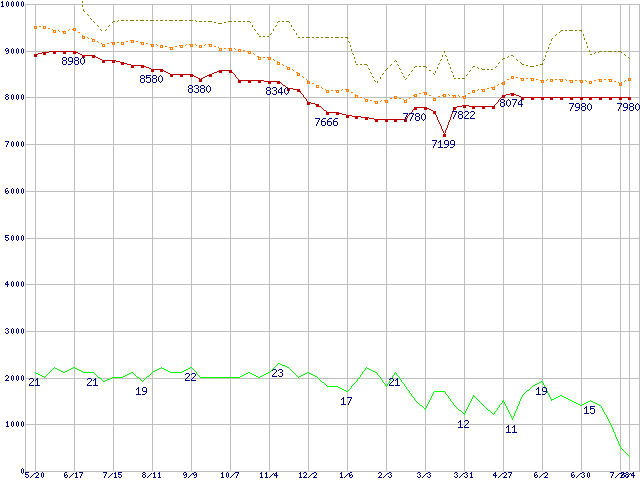 | HDS722512VLAT20 (120GB,2MB)の価格推移 | | | (2004年5月20日~2005年8月4日) |
