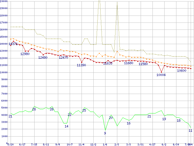 ※このグラフは過去のデータも税率5%相当に調整した税込み相当額のグラフです。 税率変更や、総額表示方式導入(2004年4月)の影響は除いています。 | | | ●凡例 | 最安値 (点線部は販売店未確認 または未調査) | 平均値 | 最高値 | ショップ数 |