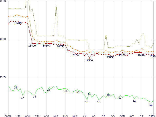 ※このグラフは過去のデータも税率5%相当に調整した税込み相当額のグラフです。 税率変更や、総額表示方式導入(2004年4月)の影響は除いています。 | | | ●凡例 | 最安値 (点線部は販売店未確認 または未調査) | 平均値 | 最高値 | ショップ数 |