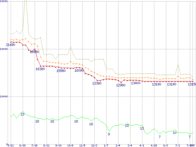 ※このグラフは過去のデータも税率5%相当に調整した税込み相当額のグラフです。 税率変更や、総額表示方式導入(2004年4月)の影響は除いています。 | | | ●凡例 | 最安値 (点線部は販売店未確認 または未調査) | 平均値 | 最高値 | ショップ数 |