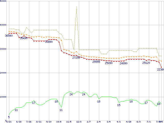※このグラフは過去のデータも税率5%相当に調整した税込み相当額のグラフです。 税率変更や、総額表示方式導入(2004年4月)の影響は除いています。 | | | ●凡例 | 最安値 (点線部は販売店未確認 または未調査) | 平均値 | 最高値 | ショップ数 |