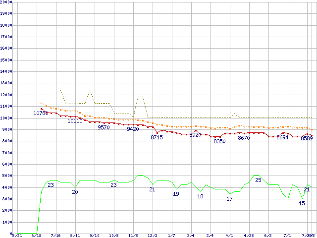 ※このグラフは過去のデータも税率5%相当に調整した税込み相当額のグラフです。 税率変更や、総額表示方式導入(2004年4月)の影響は除いています。 | | | ●凡例 | 最安値 (点線部は販売店未確認 または未調査) | 平均値 | 最高値 | ショップ数 |