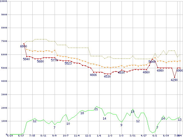 ※このグラフは過去のデータも税率5%相当に調整した税込み相当額のグラフです。 税率変更や、総額表示方式導入(2004年4月)の影響は除いています。 | | | ●凡例 | 最安値 (点線部は販売店未確認 または未調査) | 平均値 | 最高値 | ショップ数 |
