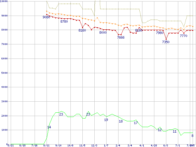 ※このグラフは過去のデータも税率5%相当に調整した税込み相当額のグラフです。 税率変更や、総額表示方式導入(2004年4月)の影響は除いています。 | | | ●凡例 | 最安値 (点線部は販売店未確認 または未調査) | 平均値 | 最高値 | ショップ数 |