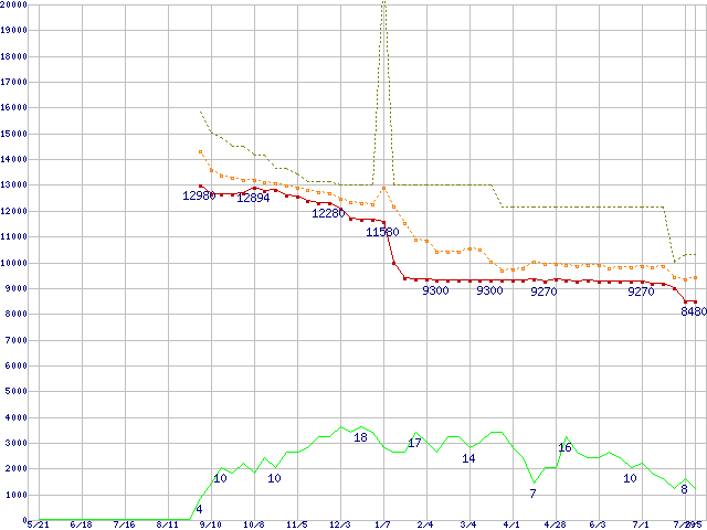 ※このグラフは過去のデータも税率5%相当に調整した税込み相当額のグラフです。 税率変更や、総額表示方式導入(2004年4月)の影響は除いています。 | | | ●凡例 | 最安値 (点線部は販売店未確認 または未調査) | 平均値 | 最高値 | ショップ数 |