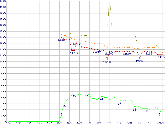 ※このグラフは過去のデータも税率5%相当に調整した税込み相当額のグラフです。 税率変更や、総額表示方式導入(2004年4月)の影響は除いています。 | | | ●凡例 | 最安値 (点線部は販売店未確認 または未調査) | 平均値 | 最高値 | ショップ数 |