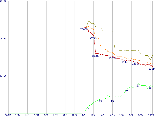 ※このグラフは過去のデータも税率5%相当に調整した税込み相当額のグラフです。 税率変更や、総額表示方式導入(2004年4月)の影響は除いています。 | | | ●凡例 | 最安値 (点線部は販売店未確認 または未調査) | 平均値 | 最高値 | ショップ数 |