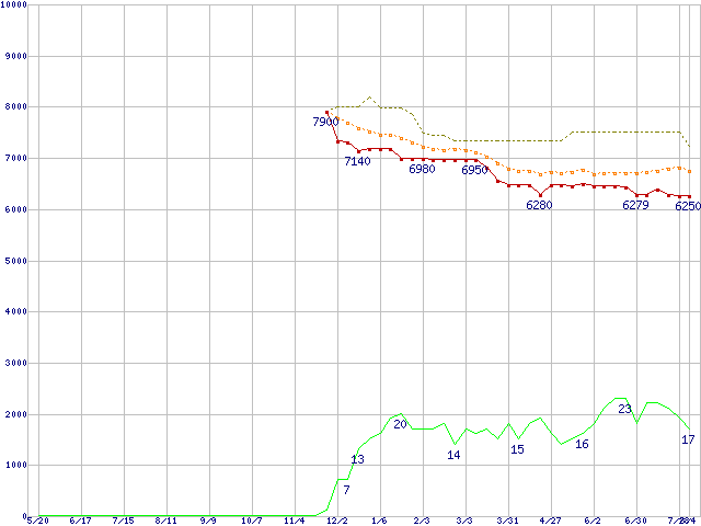 ※このグラフは過去のデータも税率5%相当に調整した税込み相当額のグラフです。 税率変更や、総額表示方式導入(2004年4月)の影響は除いています。 | | | ●凡例 | 最安値 (点線部は販売店未確認 または未調査) | 平均値 | 最高値 | ショップ数 |