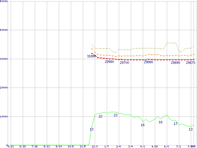 ※このグラフは過去のデータも税率5%相当に調整した税込み相当額のグラフです。 税率変更や、総額表示方式導入(2004年4月)の影響は除いています。 | | | ●凡例 | 最安値 (点線部は販売店未確認 または未調査) | 平均値 | 最高値 | ショップ数 |