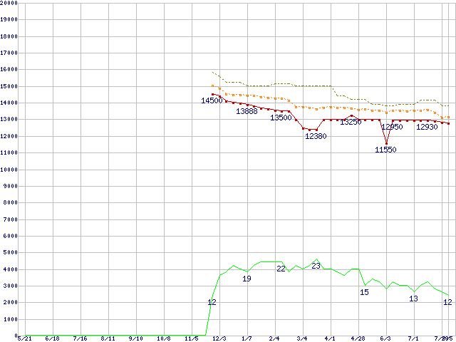 ※このグラフは過去のデータも税率5%相当に調整した税込み相当額のグラフです。 税率変更や、総額表示方式導入(2004年4月)の影響は除いています。 | | | ●凡例 | 最安値 (点線部は販売店未確認 または未調査) | 平均値 | 最高値 | ショップ数 |