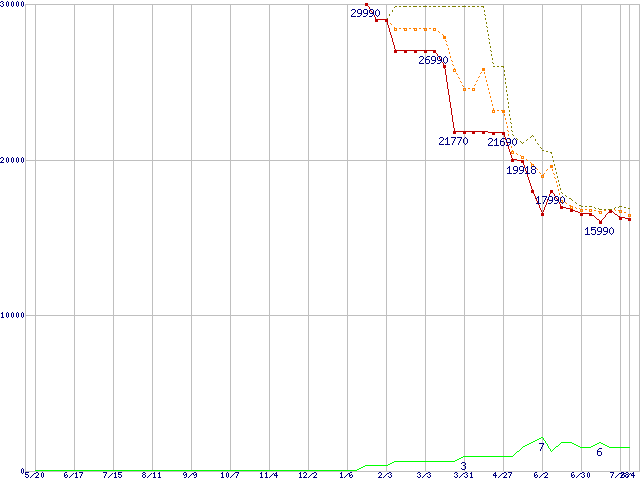 ※このグラフは過去のデータも税率5%相当に調整した税込み相当額のグラフです。 税率変更や、総額表示方式導入(2004年4月)の影響は除いています。 | | | ●凡例 | 最安値 (点線部は販売店未確認 または未調査) | 平均値 | 最高値 | ショップ数 |