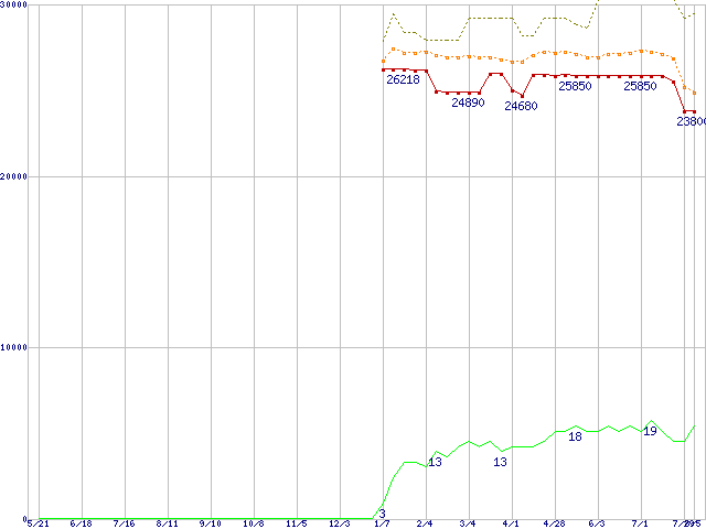 ※このグラフは過去のデータも税率5%相当に調整した税込み相当額のグラフです。 税率変更や、総額表示方式導入(2004年4月)の影響は除いています。 | | | ●凡例 | 最安値 (点線部は販売店未確認 または未調査) | 平均値 | 最高値 | ショップ数 |