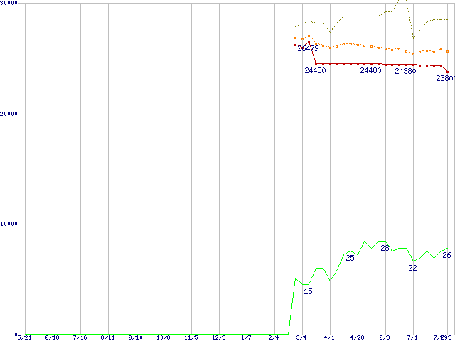 ※このグラフは過去のデータも税率5%相当に調整した税込み相当額のグラフです。 税率変更や、総額表示方式導入(2004年4月)の影響は除いています。 | | | ●凡例 | 最安値 (点線部は販売店未確認 または未調査) | 平均値 | 最高値 | ショップ数 |