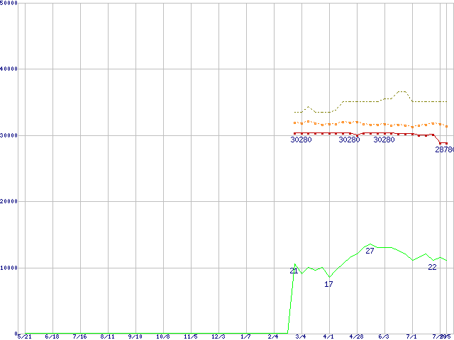 ※このグラフは過去のデータも税率5%相当に調整した税込み相当額のグラフです。 税率変更や、総額表示方式導入(2004年4月)の影響は除いています。 | | | ●凡例 | 最安値 (点線部は販売店未確認 または未調査) | 平均値 | 最高値 | ショップ数 |