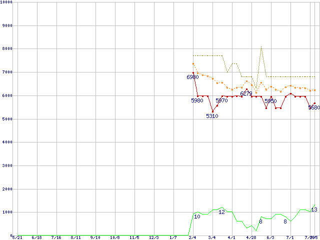 ※このグラフは過去のデータも税率5%相当に調整した税込み相当額のグラフです。 税率変更や、総額表示方式導入(2004年4月)の影響は除いています。 | | | ●凡例 | 最安値 (点線部は販売店未確認 または未調査) | 平均値 | 最高値 | ショップ数 |