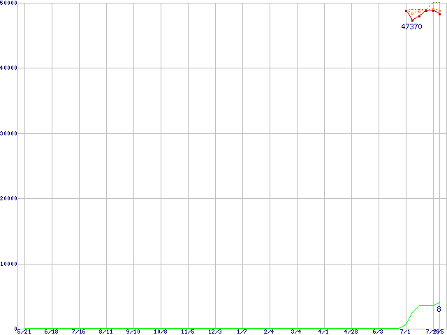 ※このグラフは過去のデータも税率5%相当に調整した税込み相当額のグラフです。 税率変更や、総額表示方式導入(2004年4月)の影響は除いています。 | | | ●凡例 | 最安値 (点線部は販売店未確認 または未調査) | 平均値 | 最高値 | ショップ数 |