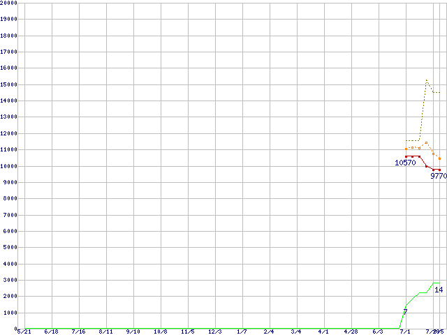 ※このグラフは過去のデータも税率5%相当に調整した税込み相当額のグラフです。 税率変更や、総額表示方式導入(2004年4月)の影響は除いています。 | | | ●凡例 | 最安値 (点線部は販売店未確認 または未調査) | 平均値 | 最高値 | ショップ数 |