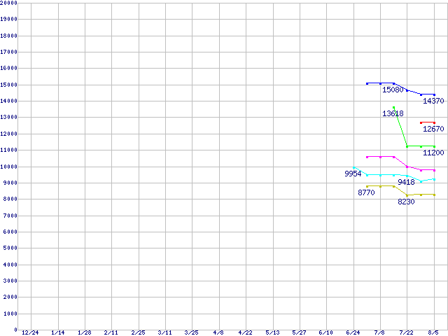| LGA 775 (FC-LGA42,533MHz,L2 256KB,Prescott,EM64T・NX bit対応)の最安値推移 | | | (2004年12月24日~2005年8月5日) |