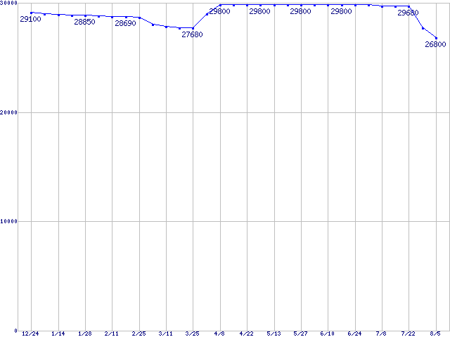 | LGA 775 (FC-LGA4 ,FSB 800MHz,L2 1MB,Hyper-Threading,Prescott)の最安値推移 | | | (2004年12月24日~2005年8月5日) |