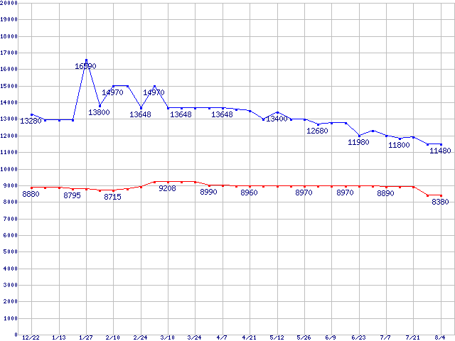 | WD Caviar[Special Edition] (7200rpm,Ultra ATA/100,8MB)の最安値推移 | | | (2004年12月22日~2005年8月4日) |