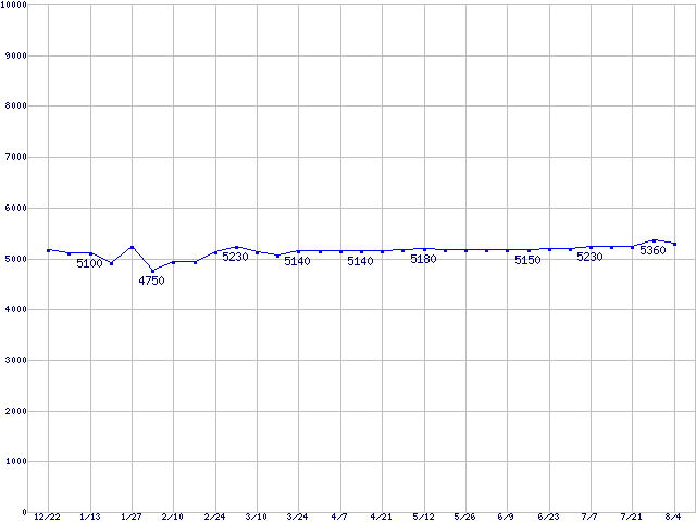 | DiamondMax Plus 8 (7200rpm,2MB,Ultra ATA/133)の最安値推移 | | | (2004年12月22日~2005年8月4日) |