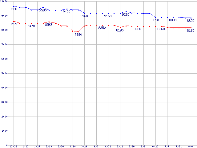 | Barracuda 7200.7 Plus (7200rpm,Ultra ATA/100,8MB,80GB/Platter)の最安値推移 | | | (2004年12月22日~2005年8月4日) |