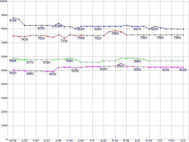 | Barracuda 7200.7 (7200rpm,Ultra ATA/100,2MB,80GB/Platter)の最安値推移 | | | (2004年12月22日~2005年8月4日) |