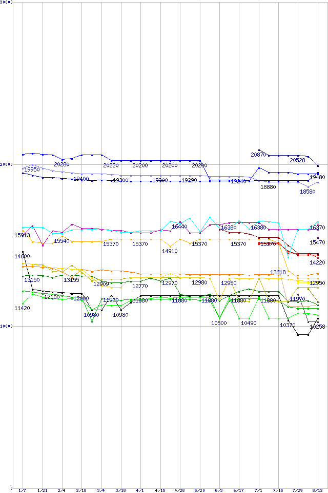 | CPU主要製品(最安値1万円~2万円未満)の最安値推移 | | | (2005年1月7日~2005年8月12日) |