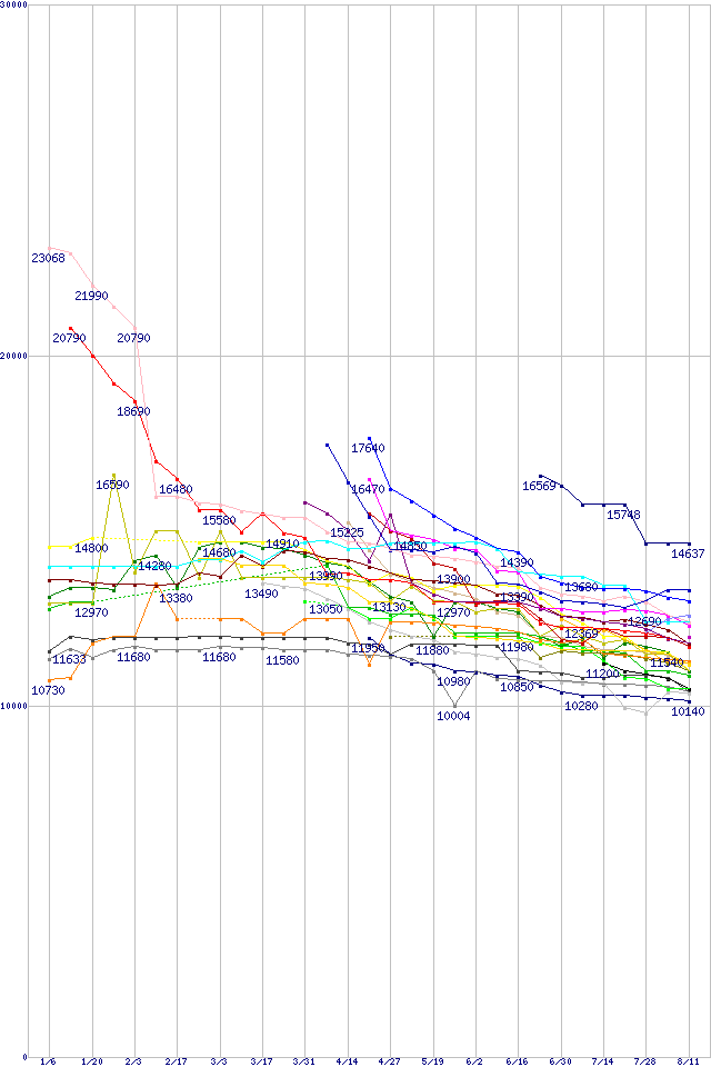 | HDD主要製品(最安値1万円~1万5千円未満)の最安値推移 | | | (2005年1月6日~2005年8月11日) |