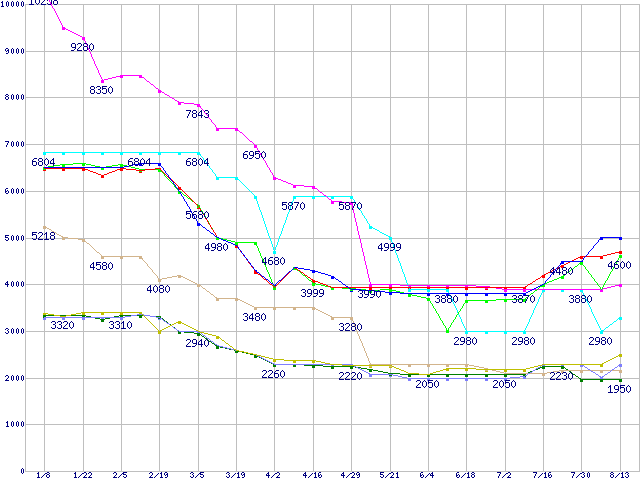 メモリ主要製品(最安値5千円~1万円未満)の最安値推移