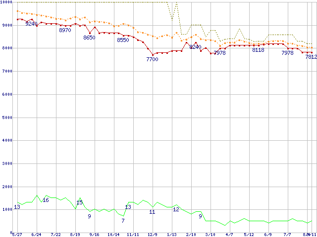※このグラフは過去のデータも税率5%相当に調整した税込み相当額のグラフです。 税率変更や、総額表示方式導入(2004年4月)の影響は除いています。 | | | ●凡例 | 最安値 (点線部は販売店未確認 または未調査) | 平均値 | 最高値 | ショップ数 |
