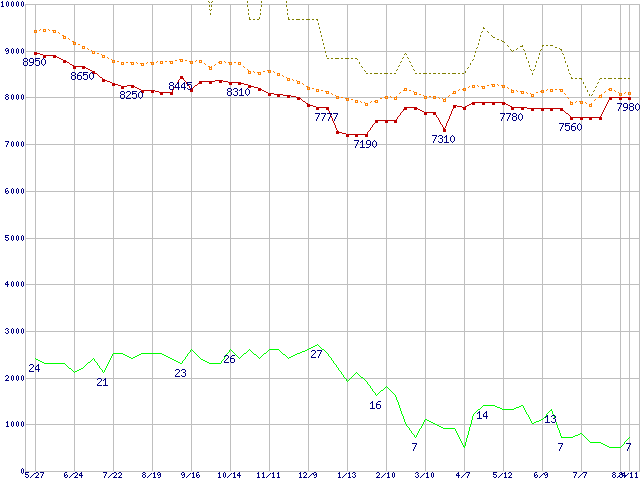 ※このグラフは過去のデータも税率5%相当に調整した税込み相当額のグラフです。 税率変更や、総額表示方式導入(2004年4月)の影響は除いています。 | | | ●凡例 | 最安値 (点線部は販売店未確認 または未調査) | 平均値 | 最高値 | ショップ数 |