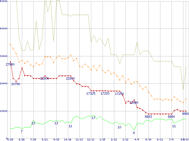 ※このグラフは過去のデータも税率5%相当に調整した税込み相当額のグラフです。 税率変更や、総額表示方式導入(2004年4月)の影響は除いています。 | | | ●凡例 | 最安値 (点線部は販売店未確認 または未調査) | 平均値 | 最高値 | ショップ数 |