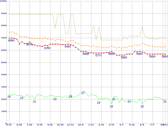 ※このグラフは過去のデータも税率5%相当に調整した税込み相当額のグラフです。 税率変更や、総額表示方式導入(2004年4月)の影響は除いています。 | | | ●凡例 | 最安値 (点線部は販売店未確認 または未調査) | 平均値 | 最高値 | ショップ数 |