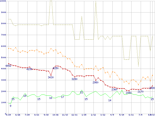 ※このグラフは過去のデータも税率5%相当に調整した税込み相当額のグラフです。 税率変更や、総額表示方式導入(2004年4月)の影響は除いています。 | | | ●凡例 | 最安値 (点線部は販売店未確認 または未調査) | 平均値 | 最高値 | ショップ数 |