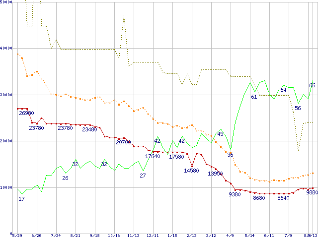 ※このグラフは過去のデータも税率5%相当に調整した税込み相当額のグラフです。 税率変更や、総額表示方式導入(2004年4月)の影響は除いています。 | | | ●凡例 | 最安値 (点線部は販売店未確認 または未調査) | 平均値 | 最高値 | ショップ数 |