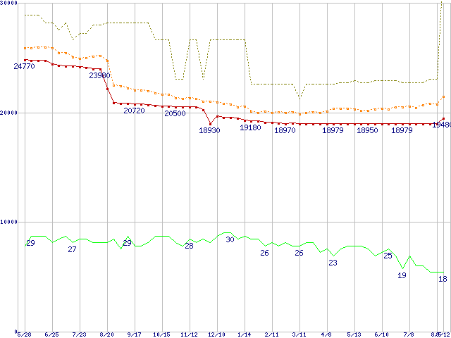 ※このグラフは過去のデータも税率5%相当に調整した税込み相当額のグラフです。 税率変更や、総額表示方式導入(2004年4月)の影響は除いています。 | | | ●凡例 | 最安値 (点線部は販売店未確認 または未調査) | 平均値 | 最高値 | ショップ数 |