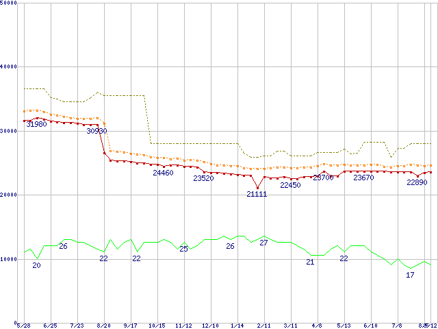 ※このグラフは過去のデータも税率5%相当に調整した税込み相当額のグラフです。 税率変更や、総額表示方式導入(2004年4月)の影響は除いています。 | | | ●凡例 | 最安値 (点線部は販売店未確認 または未調査) | 平均値 | 最高値 | ショップ数 |