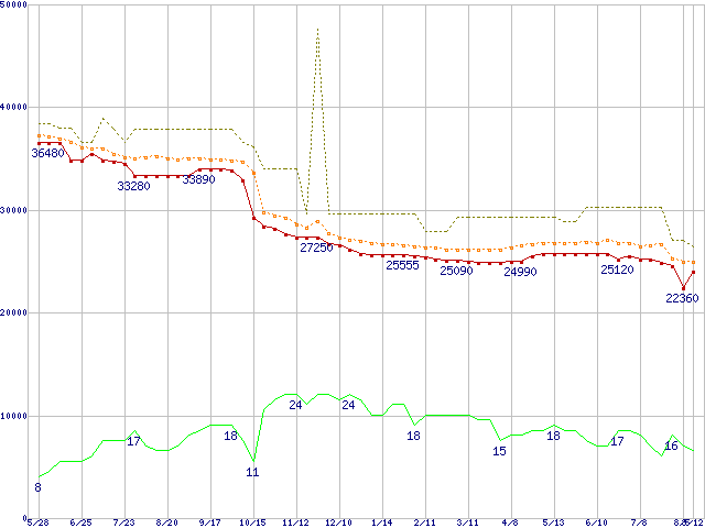 ※このグラフは過去のデータも税率5%相当に調整した税込み相当額のグラフです。 税率変更や、総額表示方式導入(2004年4月)の影響は除いています。 | | | ●凡例 | 最安値 (点線部は販売店未確認 または未調査) | 平均値 | 最高値 | ショップ数 |