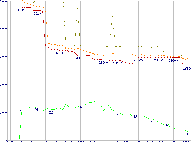 ※このグラフは過去のデータも税率5%相当に調整した税込み相当額のグラフです。 税率変更や、総額表示方式導入(2004年4月)の影響は除いています。 | | | ●凡例 | 最安値 (点線部は販売店未確認 または未調査) | 平均値 | 最高値 | ショップ数 |