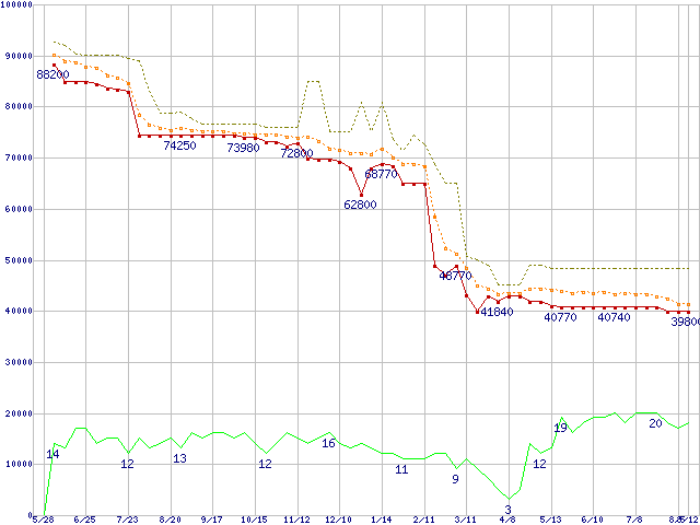 | Athlon 64 3800+ (2.4GHz,L2 512KB)の価格推移 | | | (2004年5月28日~2005年8月12日) |
