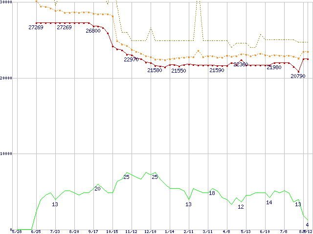 ※このグラフは過去のデータも税率5%相当に調整した税込み相当額のグラフです。 税率変更や、総額表示方式導入(2004年4月)の影響は除いています。 | | | ●凡例 | 最安値 (点線部は販売店未確認 または未調査) | 平均値 | 最高値 | ショップ数 |