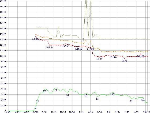 ※このグラフは過去のデータも税率5%相当に調整した税込み相当額のグラフです。 税率変更や、総額表示方式導入(2004年4月)の影響は除いています。 | | | ●凡例 | 最安値 (点線部は販売店未確認 または未調査) | 平均値 | 最高値 | ショップ数 |