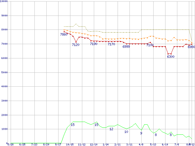 ※このグラフは過去のデータも税率5%相当に調整した税込み相当額のグラフです。 税率変更や、総額表示方式導入(2004年4月)の影響は除いています。 | | | ●凡例 | 最安値 (点線部は販売店未確認 または未調査) | 平均値 | 最高値 | ショップ数 |