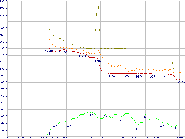 ※このグラフは過去のデータも税率5%相当に調整した税込み相当額のグラフです。 税率変更や、総額表示方式導入(2004年4月)の影響は除いています。 | | | ●凡例 | 最安値 (点線部は販売店未確認 または未調査) | 平均値 | 最高値 | ショップ数 |