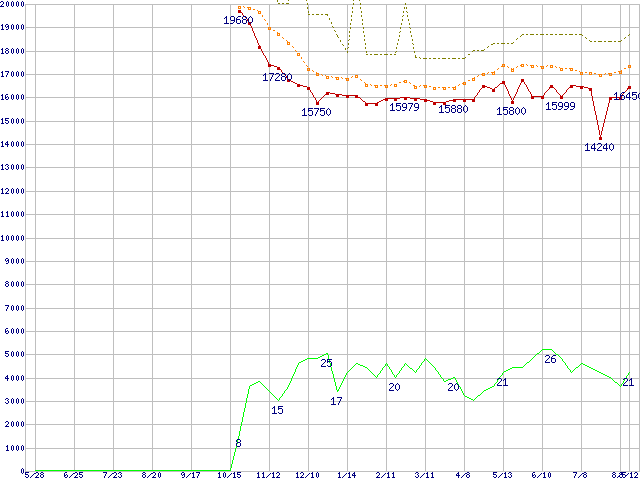| Athlon 64 3000+ (1.8GHz,L2 512KB,Socket 939)の価格推移 | | | (2004年5月28日~2005年8月12日) |