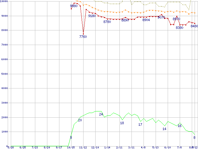 ※このグラフは過去のデータも税率5%相当に調整した税込み相当額のグラフです。 税率変更や、総額表示方式導入(2004年4月)の影響は除いています。 | | | ●凡例 | 最安値 (点線部は販売店未確認 または未調査) | 平均値 | 最高値 | ショップ数 |